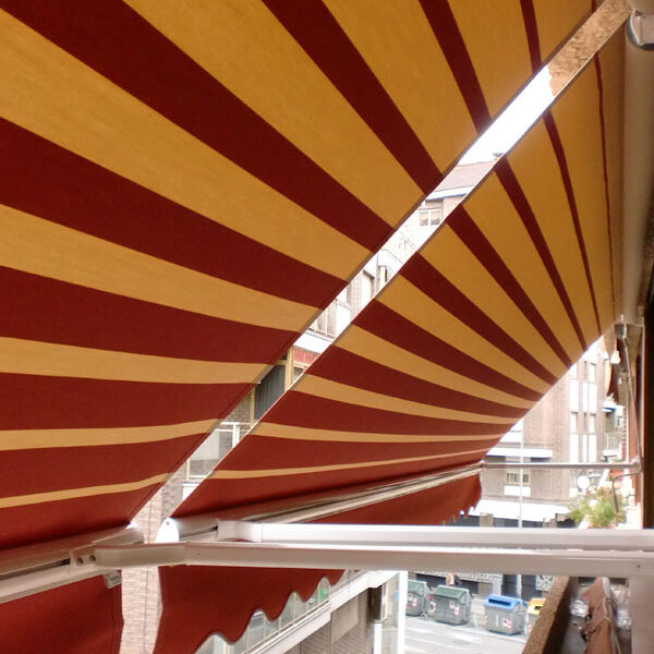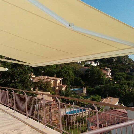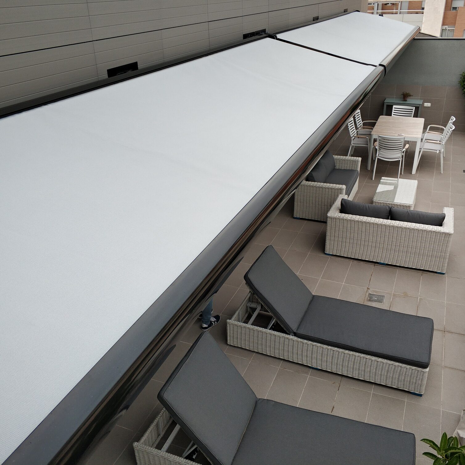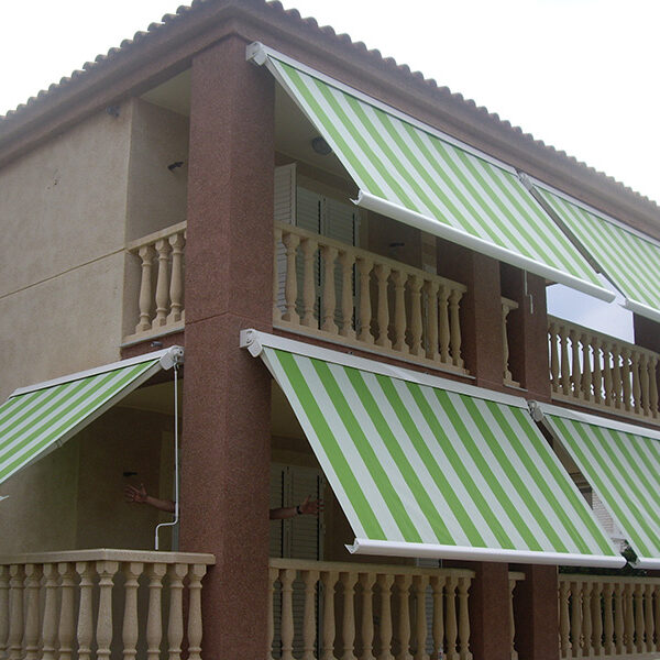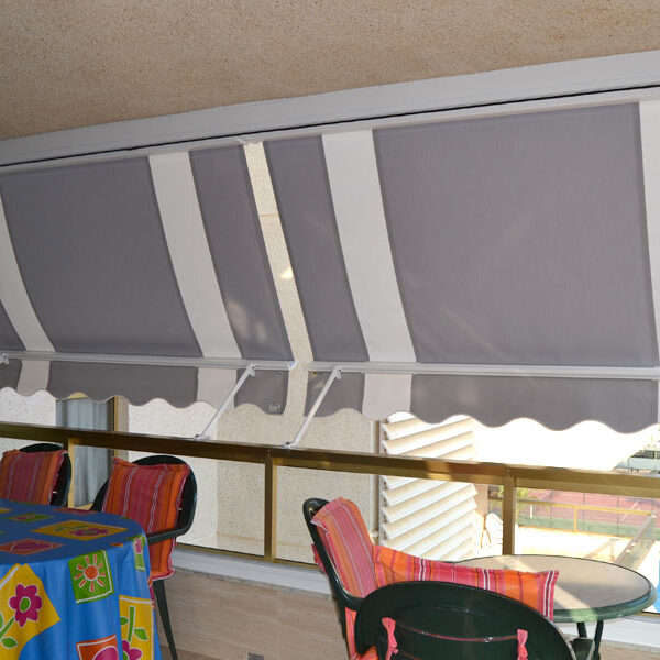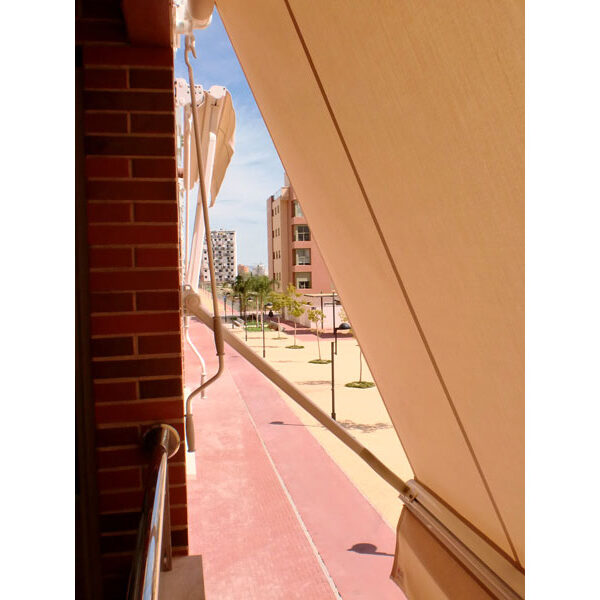 Toldo de caída vertical con brazos de 500mm que se anclan a la barandilla. Especialmente diseñado para balcones.