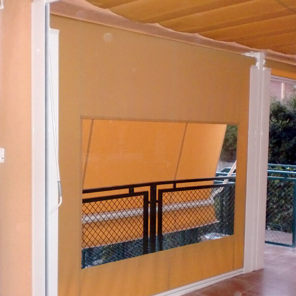 Toldo bajante guiado lateralmente por un cable de acero tensado ó una varilla de acero inox. Especialmente diseñado para cristaleras, balcones y terrazas.