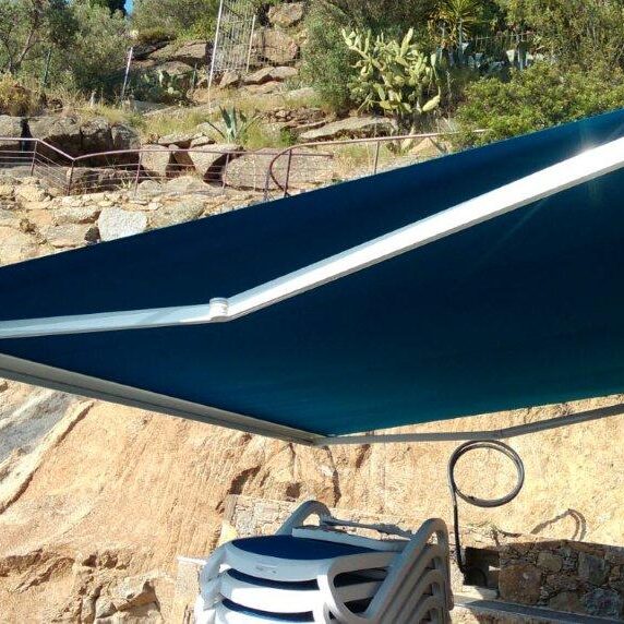 Toldo extensible de sólidos brazos articulados de doble cable. Proporciona la protección, confort y decoración del espacio dejando libre y despejada la zona que cubre.