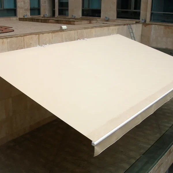 Toldo de caída vertical con cofre para protección de lona, brazos de 500 mm que se anclan a la barandilla. Especialmente diseñado para balcones.