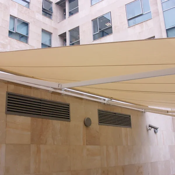 Toldo extensible de brazos articulados de doble cable. Proporciona la protección, confort y decoración del espacio sin ningún obstáculo, dejando libre y despejada la zona que cubre.