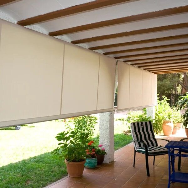 Toldo bajante con anclaje a suelo. Especialmente diseñado para la separación de espacios o la protección conta el viento en terrazas, hostelería y balcones.