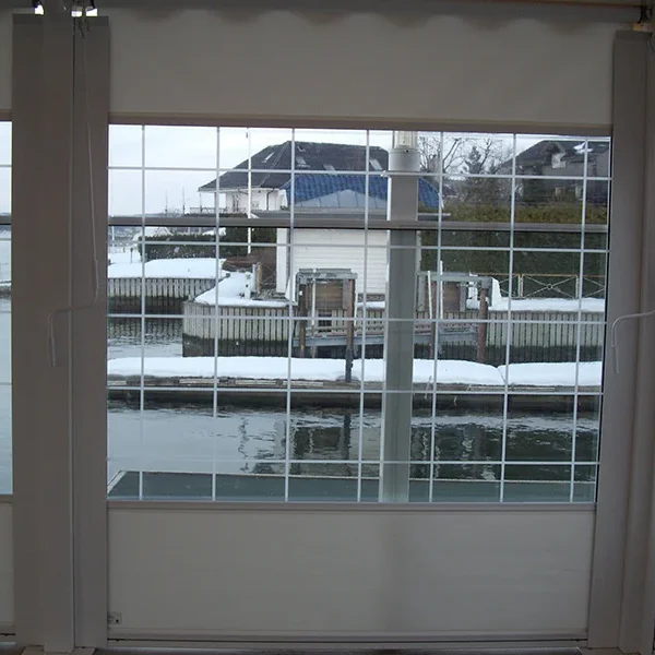Toldo bajante con guías de 120 mm, anclaje del perfil de carga a las guías laterales mediante cerrojillos. Especialmente diseñado para la separación de espacios ó la protección contra el viento en terrazas, hostelería y balcones.