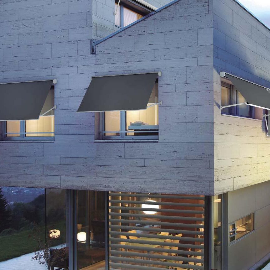 Toldo con cofre de brazos punto recto anclados a pared. Especialmente diseñado para la protección solar de balcones, ventanas, terrazas de interior y cristaleras.