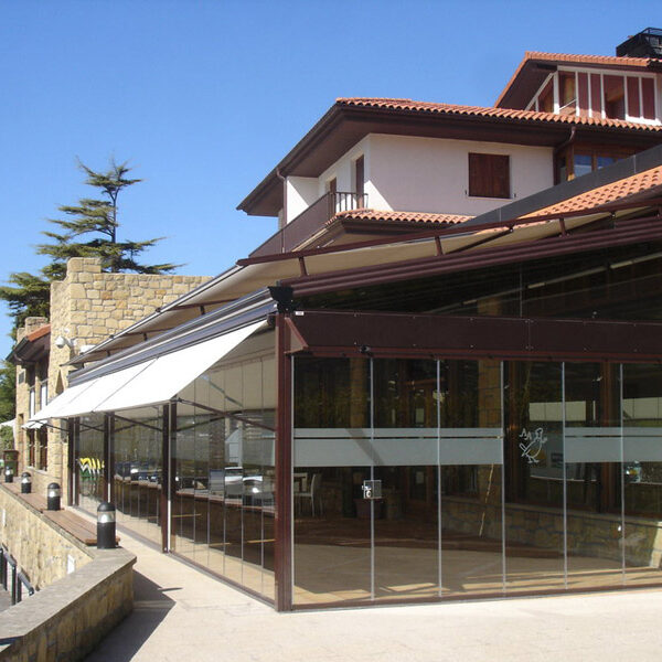 Toldo veranda con doble eje de enrolle, tensión con muelles interiores y cinta de Kevlar, que garantiza la tensión de la lona.