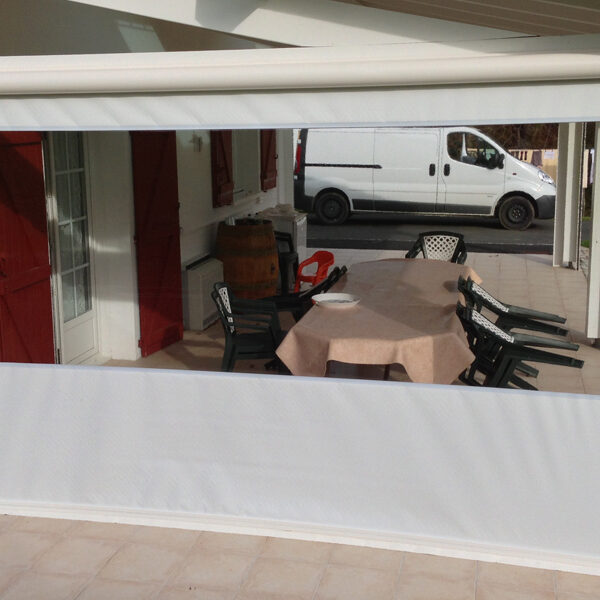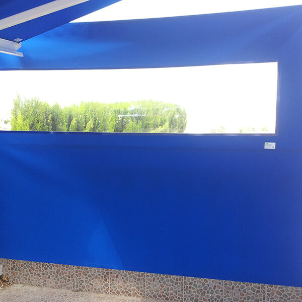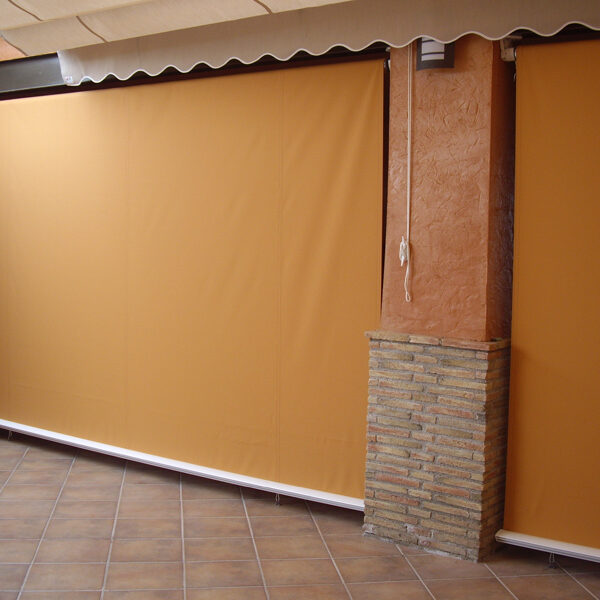 Toldo bajante con cofre para protección de lona, guiado mediante cremalleras, lo que asegura que la lona no se salga de las guías. Especialmente diseñado para la separación de espacios ó la protección contra el viento en terrazas, hostelería y balcones.