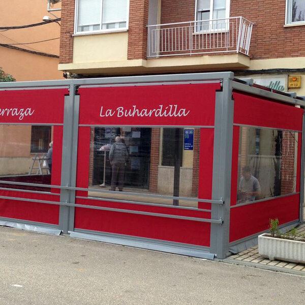 Toldo bajante con guías de 120 mm, anclaje del perfil de carga a las guías laterales mediante cerrojillos. Especialmente diseñado para la separación de espacios ó la protección contra el viento en terrazas, hostelería y balcones.