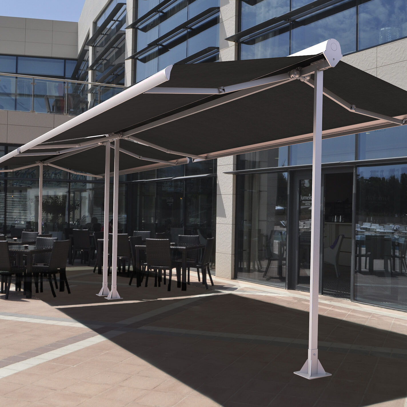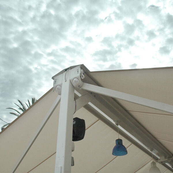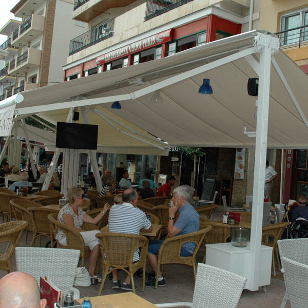 Sistema auto portante de toldo doble, montado en una portería de hierro galvanizado y lacado con tratamiento especial. Brazos articulados de cadena. Sistema muy versátil que permite tener una superficie protegida de 6 m por 6 m sin tener postes centrales, además de contar como principal característica su movilidad lo que lo hace muy versátil. Sistema ideal para terrazas de hostelería, jardines, colegios, etc.
