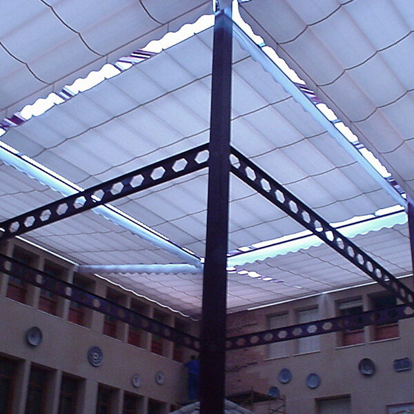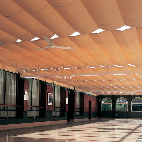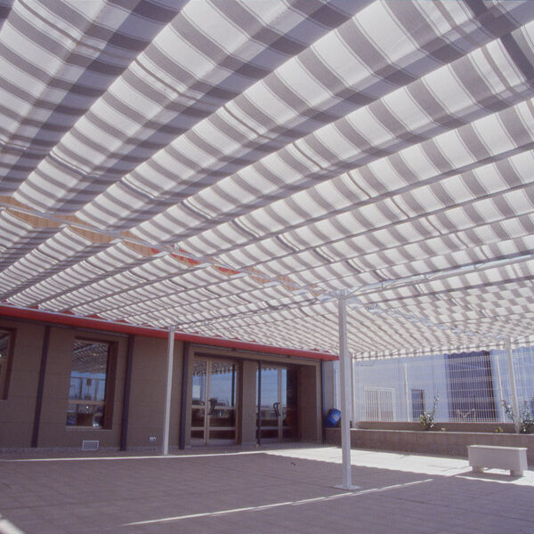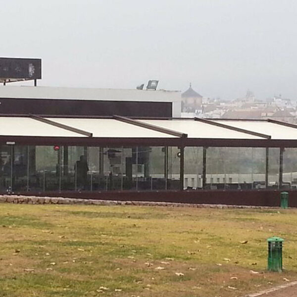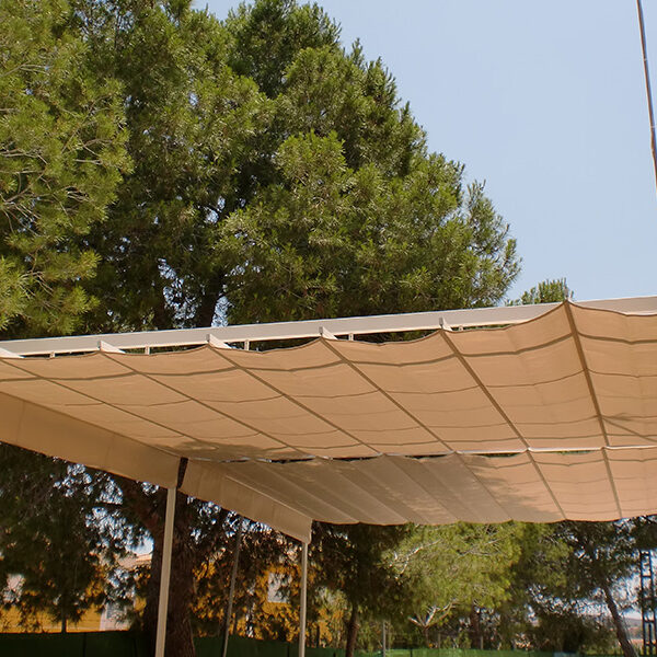 Toldo plano con tensión. Siempre motorizado, confeccionado con lona especial “opak” que garantiza su impermeabilidad. Especialmente indicado para soportar la lluvia sin desgastes ni alteraciones. Va instalado de pared trasera a portería delantera.