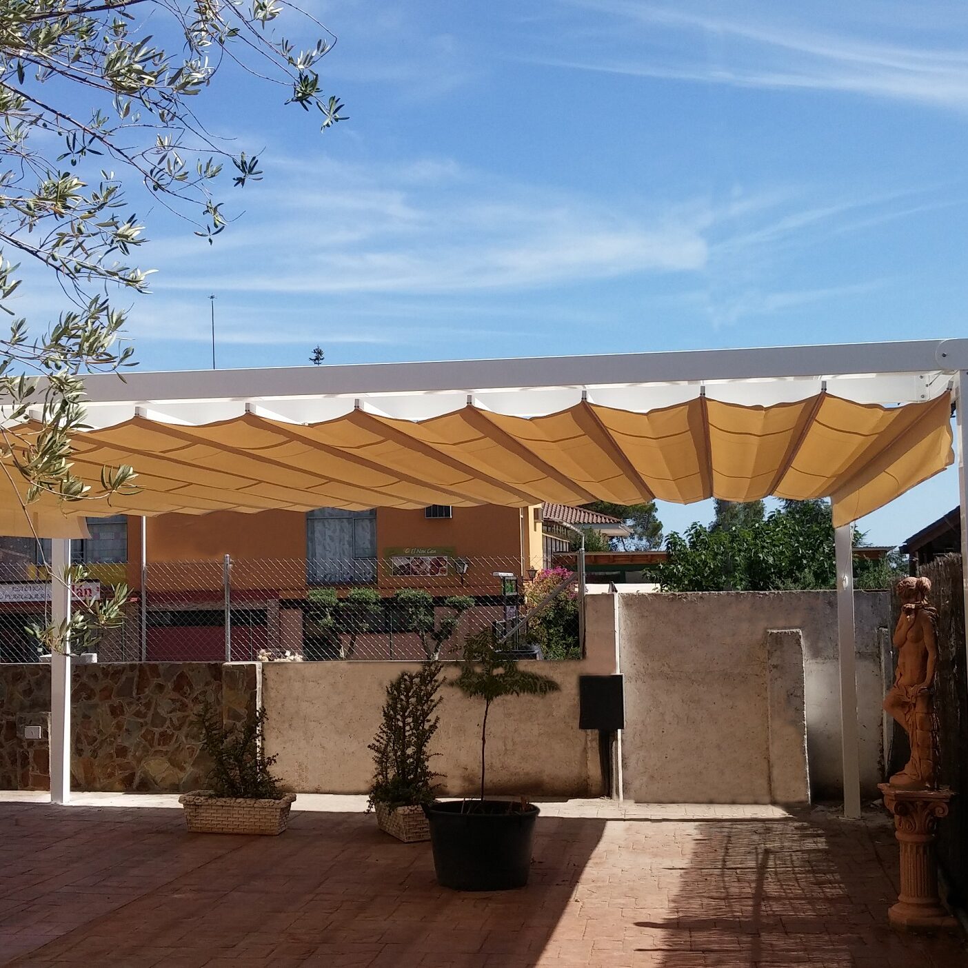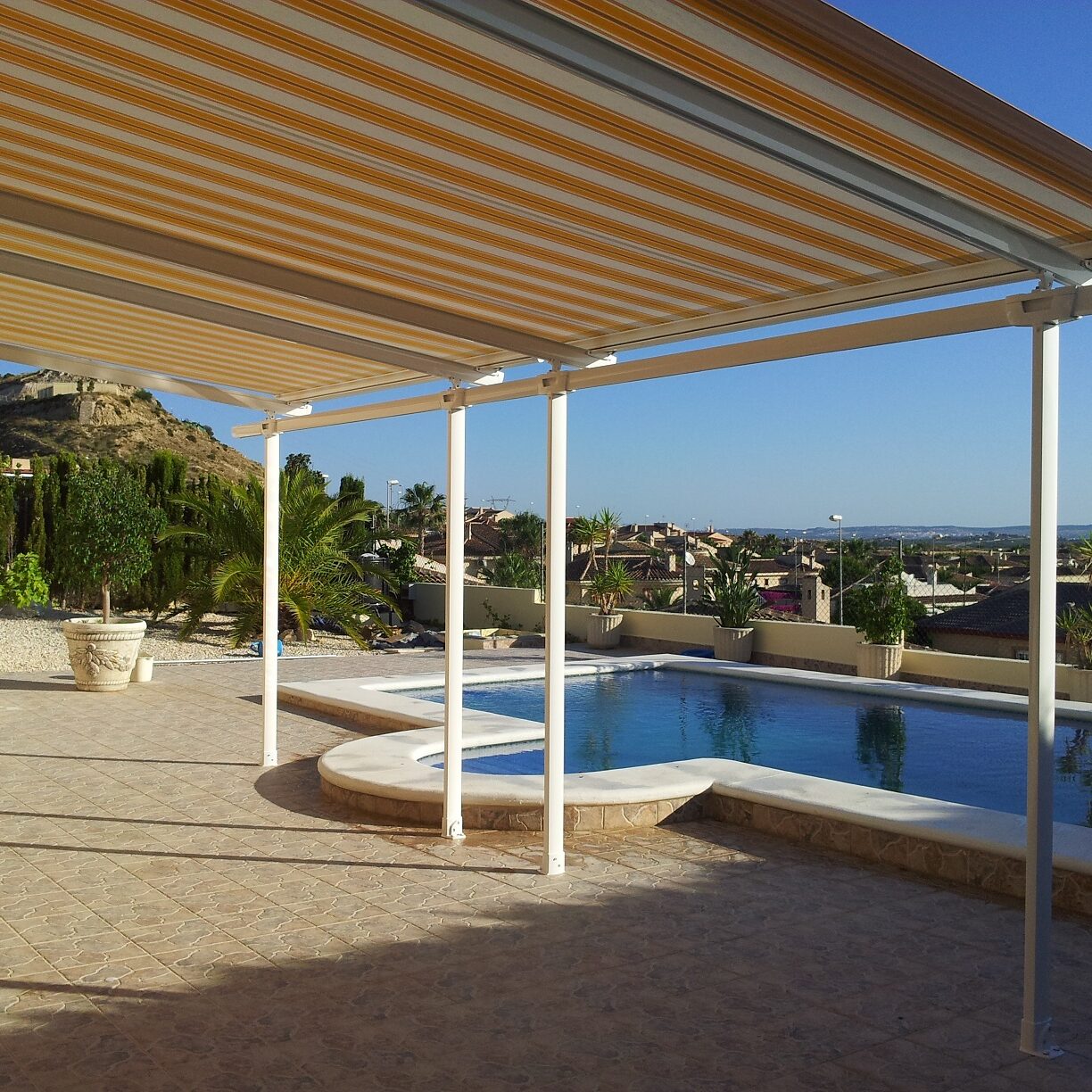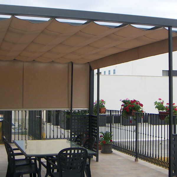 Toldo plano de palillería. Con perfiles 80 mm x 40 mm, un clásico funcional, perfecto para cubrir terrazas. Puede instalarse tanto entre paredes como con porterías.