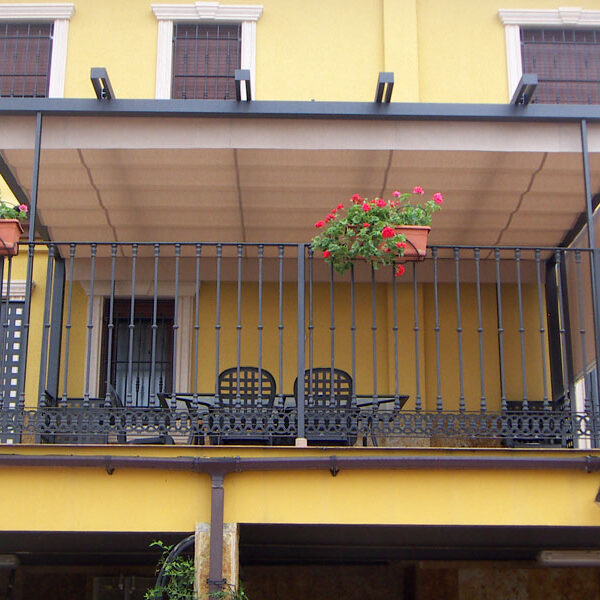 Toldo de caída vertical con brazos de 500mm que se anclan a la barandilla. Especialmente diseñado para balcones.