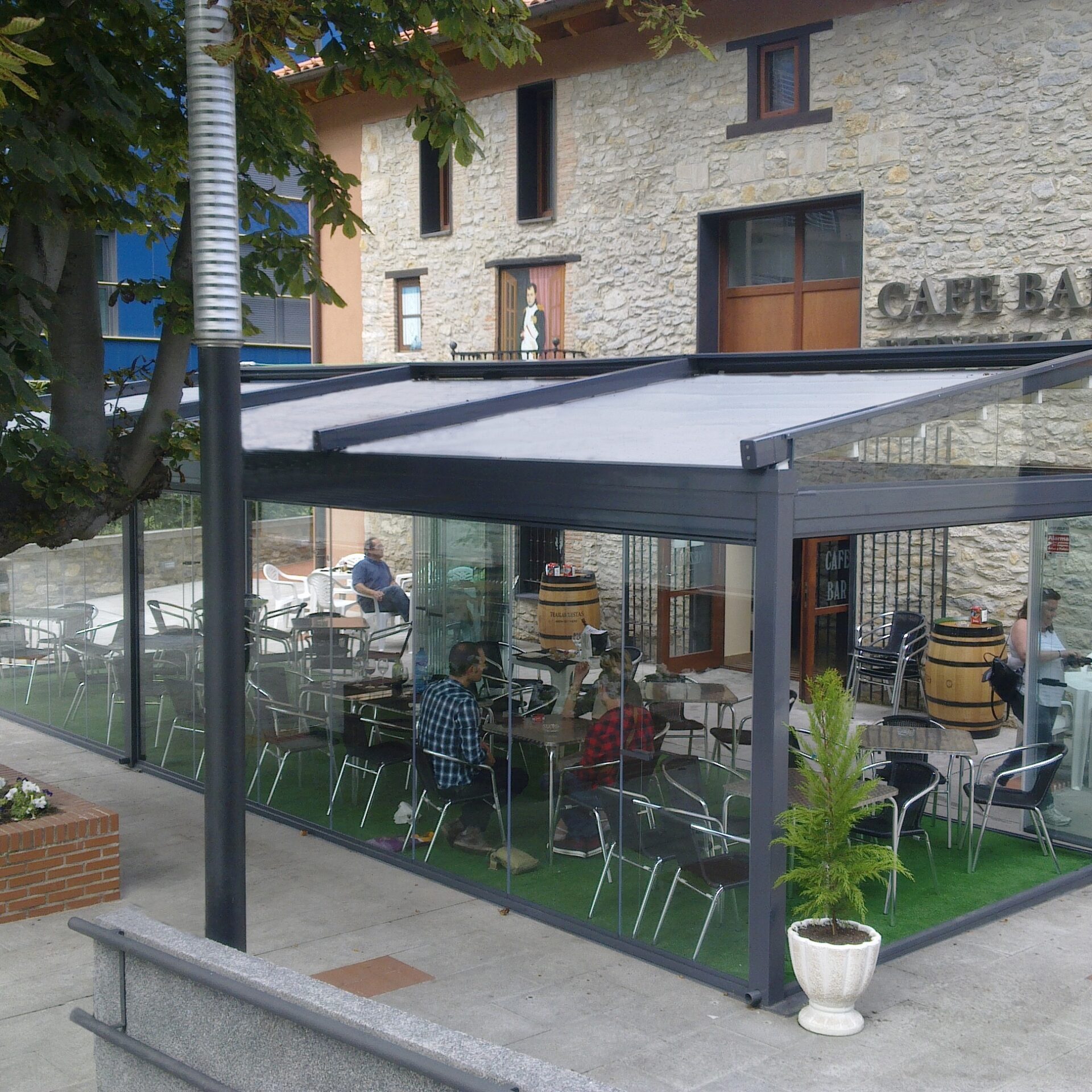 Toldo veranda por pistón de gas, que garantiza la tensión de la lona.