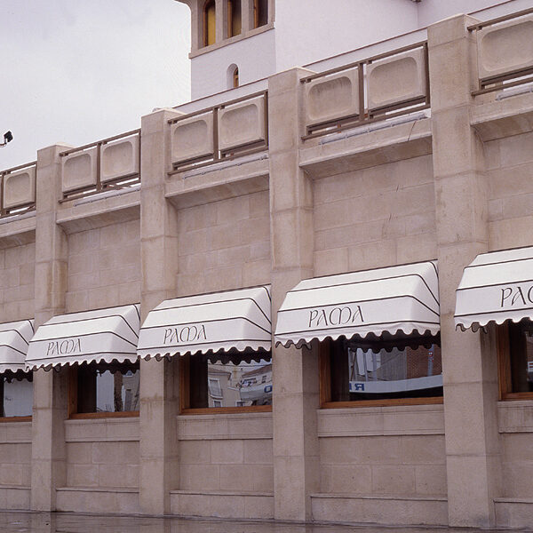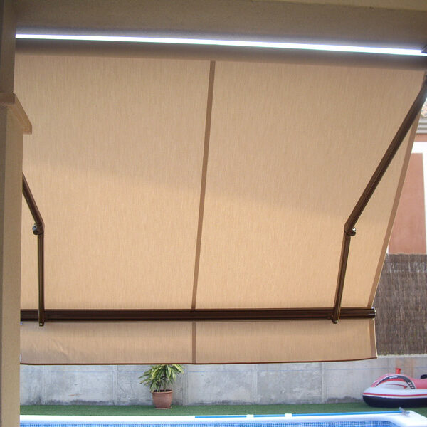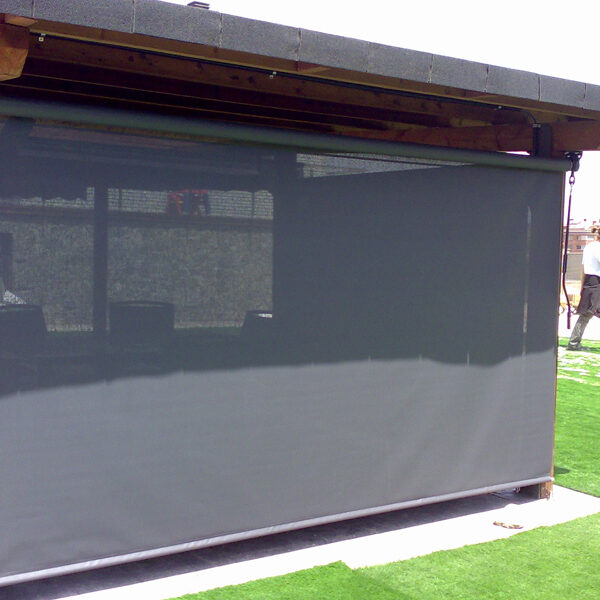 Toldo bajante con cofre para protección de lona, guiado mediante cremalleras, lo que asegura que la lona no se salga de las guías. Especialmente diseñado para la separación de espacios ó la protección contra el viento en terrazas, hostelería y balcones.