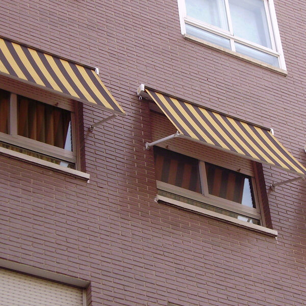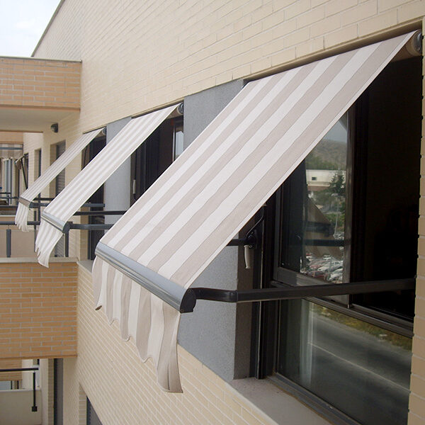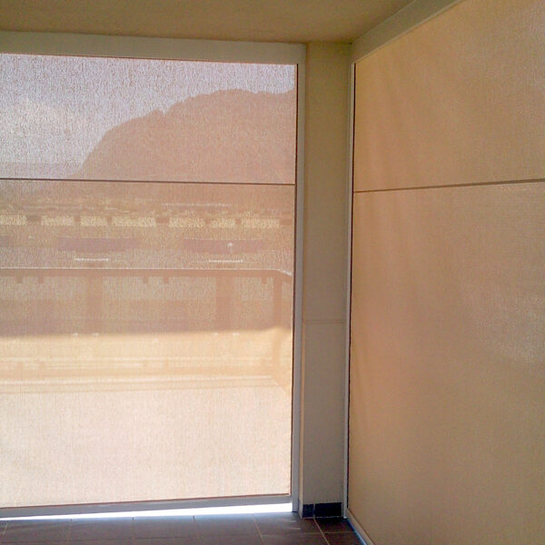 Toldo bajante guiado lateralmente por un cable de acero tensado ó una varilla de acero inox. Especialmente diseñado para cristaleras, balcones y terrazas.