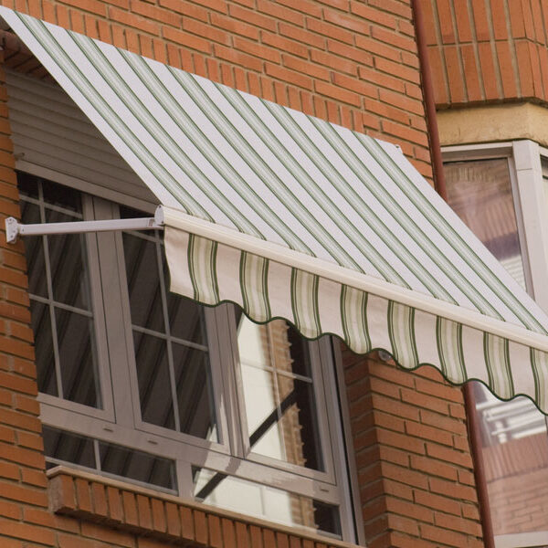 Toldo de caída vertical con cofre para protección de lona, brazos de 500 mm que se anclan a la barandilla. Especialmente diseñado para balcones.