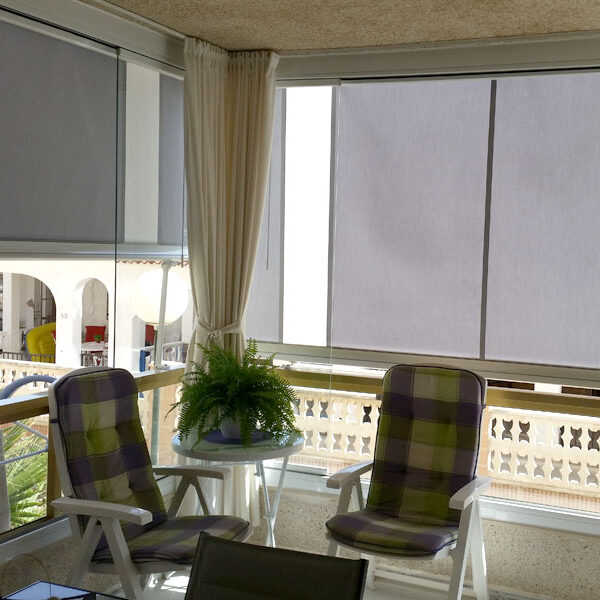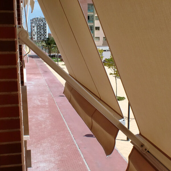 Toldo de caída vertical con brazos de 500mm que se anclan a la barandilla. Especialmente diseñado para balcones.
