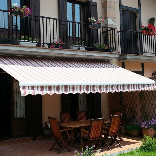 Toldo con cofre de brazos punto recto anclados a pared. Especialmente diseñado para la protección solar de balcones, ventanas, terrazas de interior y cristaleras.